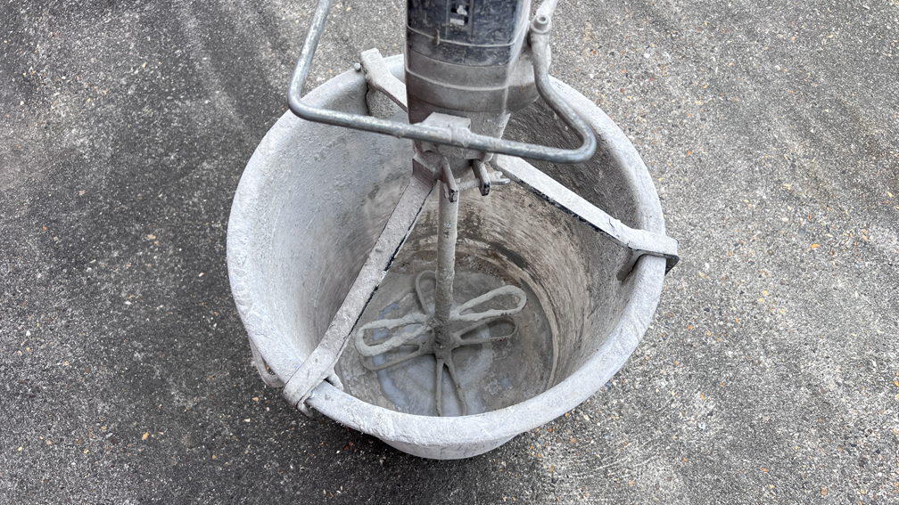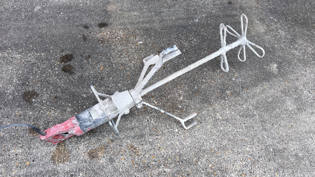 Dette effektive røreværk på hele 1300W lejes med 2 stk. 75 liters blandekar. Mixerens beslag gør at den kan mixe et kar selv mens du kommer spartelmasse i blandekaret – eller mens du ligger færdigblandet flydespartel ud med det 2. kar.